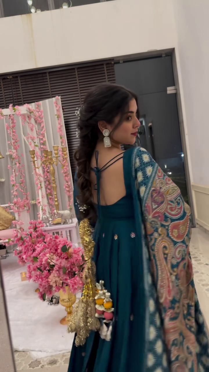 Green Skirt GGreenish Blue Chinon Silk with Embroidery Work Kurti seteorgette Bralette Raw Silk Cape Organza Set With Puff Sleeve (Copy)