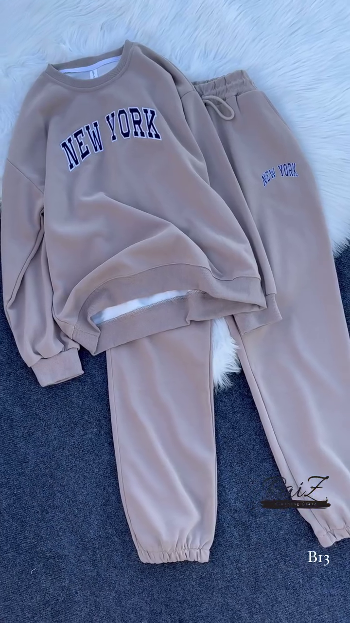 - 🧥 Top: Jet black sweatshirt with crisp white “NEW YORK” print across the chest