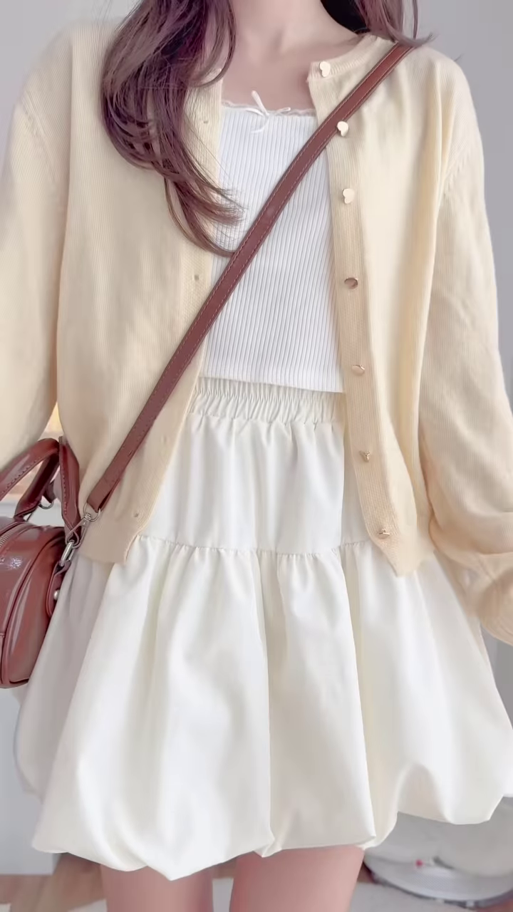 - 🟣 Light Purple: Ribbed cardigan with five bow-shaped buttons + embroidered heart with “R” detail