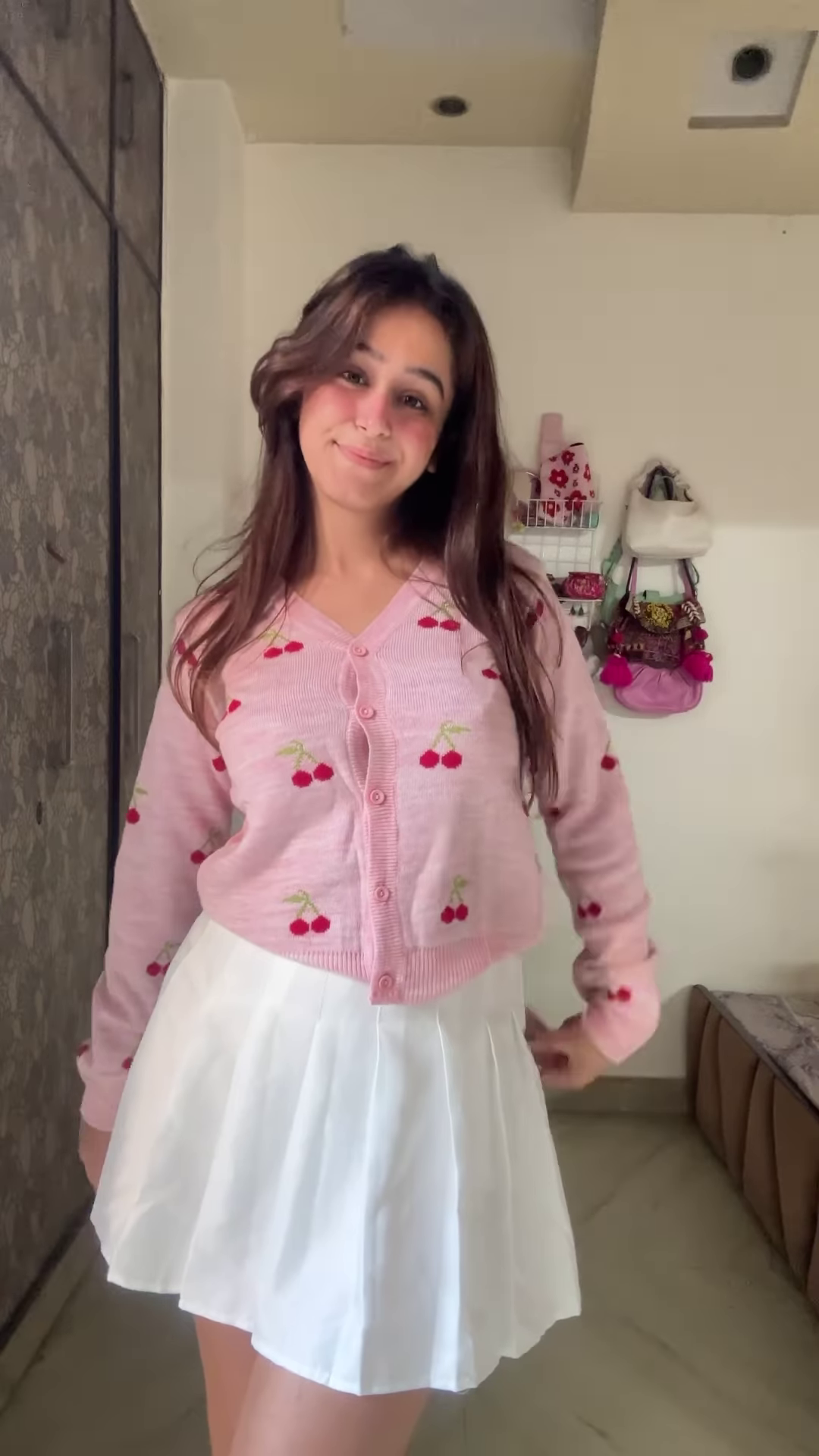 - 🍒 Pink Cherry: Soft pink cardigan with scattered cherry embroidery + paired with white pleated skirt