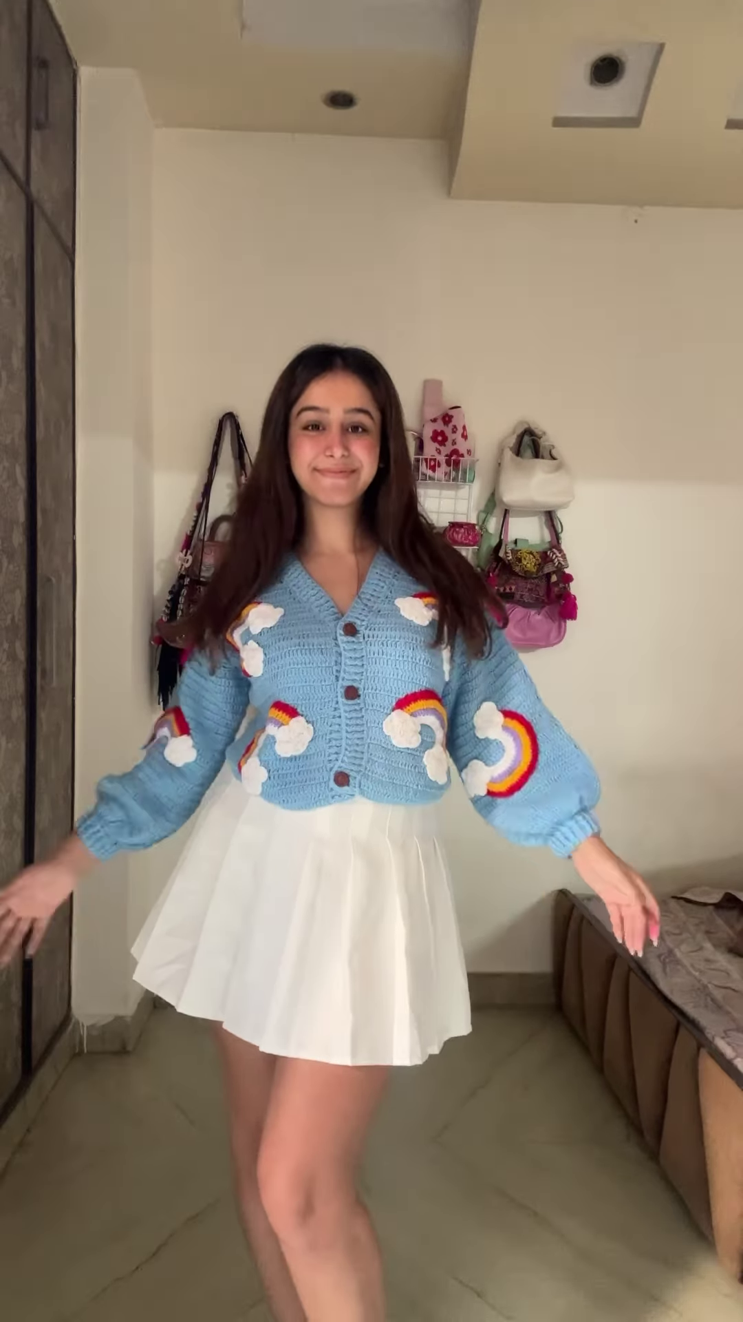 - 🌈 Blue Rainbow: Light blue knit with rainbow and cloud motifs across chest and sleeves + styled with white skirt